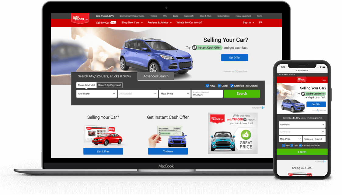 TRADER est le partenaire de marketing numérique le plus respecté du secteur automobile canadien, avec ses places d’affaires en ligne AutoHebdo.net et AutoTrader.ca. Nous procurons aux commerçants et aux constructeurs l’accès à un vaste auditoire d’acheteurs potentiels déterminés de véhicules neufs et d’occasion, ainsi qu’à des solutions sans égal de publicité numérique, de sites web, de logiciels et d’analyse. Notre sélection complète de solutions répond aux besoins en constante évolution des commerçants automobiles d’aujourd’hui.